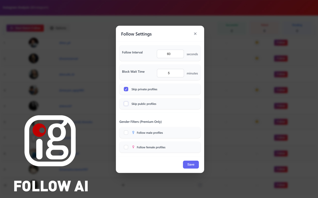 Activate AI features like gender analysis and spam prevention. These intelligent features help optimize your Instagram auto follow strategy for better results.
